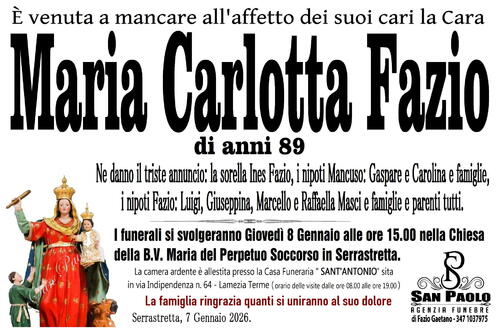 Ne danno il triste annuncio: la sorella Ines Fazio, i nipoti Mancuso: Gaspare e Carolina e famiglie,