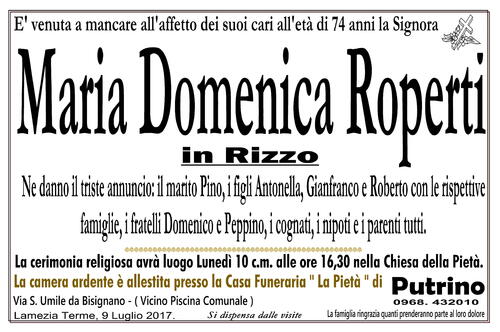 Ne danno il triste annuncio: il marito Pino, i figli Antonella, Gianfranco e Roberto con le rispettive famiglie, i fratelli Domenico e Peppino, i cognati, i nipoti e i parenti tutti.