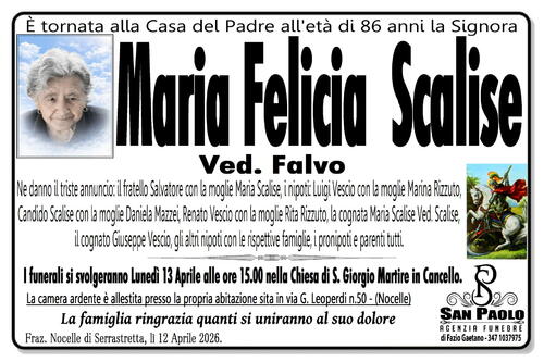 I funerali si svolgeranno Lunedì 13 Aprile alle ore 15.00 nella Chiesa di S. Giorgio Martire in Cancello.