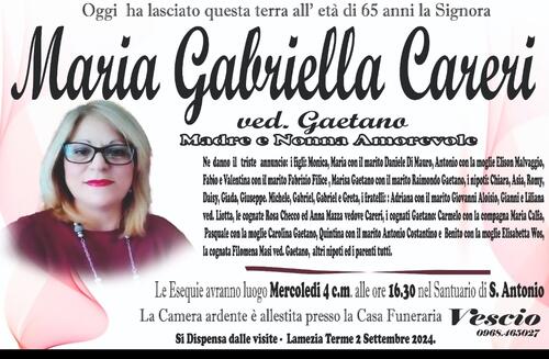 Ne danno il triste annuncio: i figli: Monica, Maria con il marito Daniele Di Mauro, Antonio con la moglie Elison Malvaggio, Fabio e Valentina con il marito Fabrizio Filice , Marisa Gaetano con il marito Raimondo Gaetano, i nipoti: Chiara, Asia, Romy, Daisy, Giada, Giuseppe. Michele, Gabriel, Gabriel e Greta, i fratelli: : Adriana con il marito Giovanni Aloisio, Gianni e Liliana ved. Liotta, le cognate Rosa Checco ed Anna Mazza vedove Careri, i cognati Gaetano: Carmelo con la compagna Maria Calfa, Pasquale con la moglie Carolina Gaetano, Quintina con il marito Antonio Costantino e Benito con la moglie Elisabetta Wos, la cognata Filomena Masi ved. Gaetano, altri nipoti ed i parenti tutti.