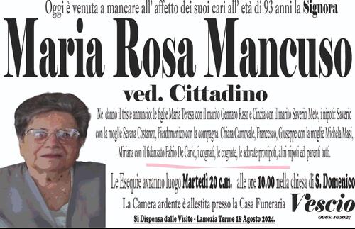 Ne danno il triste annuncio: le figlie Maria Teresa con il marito Gennaro Raso e Cinzia con il marito Saverio Mete, i nipoti: Saverio con la moglie Serena Costanzo, Pierdomenico con la compagna Chiara Carnovale, Francesco, Giuseppe con la moglie Michela Masi, Miriana con il fidanzato Fabio De Cario, i cognati, le cognate, le adorate pronipoti, altri nipoti ed parenti tutti.