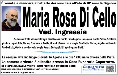 Le esequie avranno luogo Giovedì 14 Agosto alle ore 17:00 nella Chiesa della Pietà.