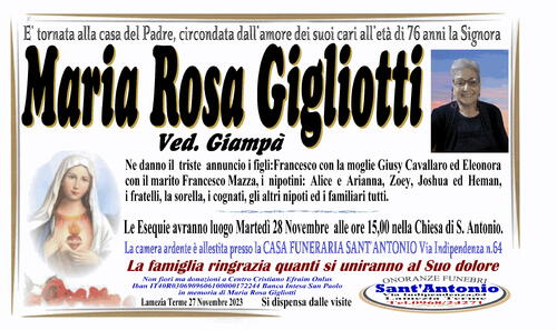 Ne danno il triste annuncio i figli: Francesco con la moglie Giusy Cavallaro ed Eleonora con il marito Francesco Mazza, i nipotini: Alice e Arianna, Zoey, Joshua ed Heman, i fratelli, la sorella, gli altri nipoti ed i familiari tutti.