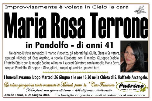 I funerali avranno luogo Martedì 26 Giugno alle ore 16,30 nella Chiesa di S. Raffaele Arcangelo.