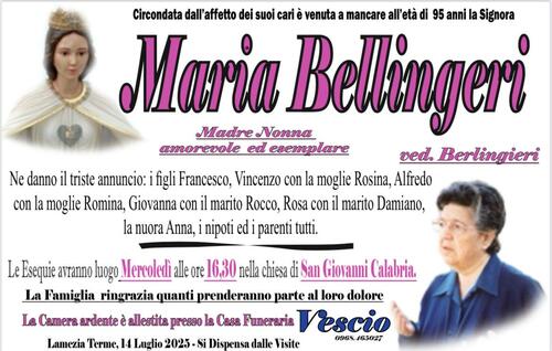 Le Esequie avranno luogo Mercoledì alle ore 16,30 nella chiesa di San Giovanni Calabria.