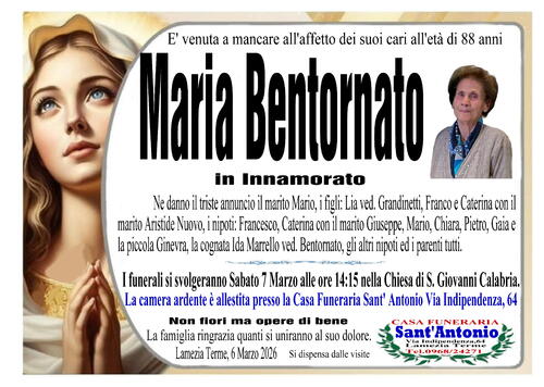 Ne danno il triste annuncio il marito Mario, i figli: Lia ved. Grandinetti, Franco e Caterina con il marito Aristide Nuovo, i nipoti: Francesco, Caterina con il marito Giuseppe, Mario, Chiara, Pietro, Gaia e la piccola Ginevra, la cognata Ida Marrello ved. Bentornato, gli altri nipoti e parenti tutti.