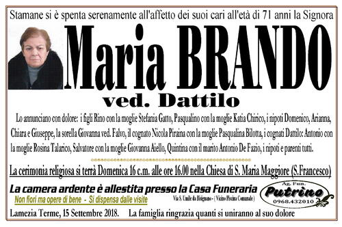 Lamezia Terme, 15 Settembre 2018. La famiglia ringrazia quanti si uniranno al suo dolore