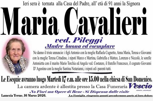 Le Esequie avranno luogo Martedì 17 c.m. alle ore 15.00 nella chiesa di San Domenico.