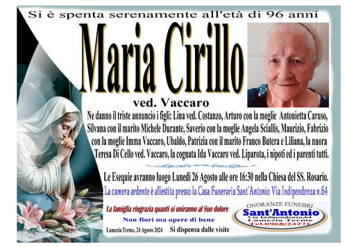 Ne danno il triste annuncio i figli: Lina ved. Costanzo, Arturo con la moglie Antonietta Caruso, Silvana con il marito Michele Durante, Saverio con la moglie Angela Sciallis, Maurizio, Fabrizio con la moglie Imma Vaccaro, Ubaldo, Patrizia con il marito Franco Butera e Liliana, la nuora Teresa Di Cello ved. Vaccaro, la cognata Ida Vaccaro ved. Liparota, i nipoti ed i parenti tutti.