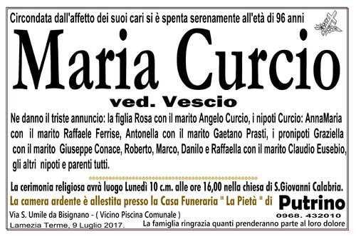 La cerimonia religiosa avrà luogo Lunedì 10 c.m. alle ore 16,00 nella chiesa di S.Giovanni Calabria.