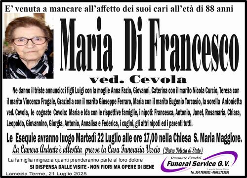 Le Esequie avranno luogo domani martedì 22 Luglio nella chieda di S. Maria Maggiore alle ore 17.00