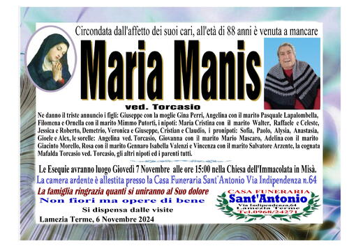 Ne danno il triste annuncio i figli: Giuseppe con la moglie Gina Perri, Angelina con il marito Pasquale Lapalombella, Filomena e Ornella con il marito Mimmo Putortì, i nipoti: Maria Cristina con il marito Walter, Raffaele e Celeste, Jessica e Roberto, Demetrio, Veronica e Giuseppe, Cristian e Claudio, i pronipoti: Sofia, Paolo, Alysia, Anastasia, Gioele e Alex, le sorelle: Angelina ved. Torcasio, Giovanna con il marito Mario Mascaro, Adelina con il marito Giacinto Morello, Rosa con il marito Gennaro Isabella Valenzi e Vincenza con il marito Salvatore Arzente, la cognata Mafalda Torcasio ved. Torcasio, gli altri nipoti ed i parenti tutti.