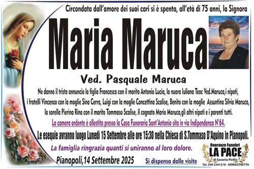 Ne danno il triste annuncio la figlia Francesca con il marito Antonio Lucia, la nuora Iuliana Teoc, i nipoti, i fratelli Vincenzo con la moglie Sina Cerra, Luigi con la moglie Concettina Scalise , Benito con la moglie Assuntina Silvia Maruca, la sorella Pierina Rina con il marito Tommaso Scalise, il cognato Mario Maruca, gli altri nipoti e i parenti tutti.
