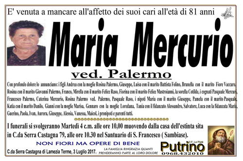 I funerali si svolgeranno Martedì 4 c.m. alle ore 10,00 muovendo dalla casa dell'estinta sita