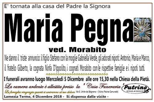 La camera ardente è allestita presso la '' Casa Funeraria'' Putrino