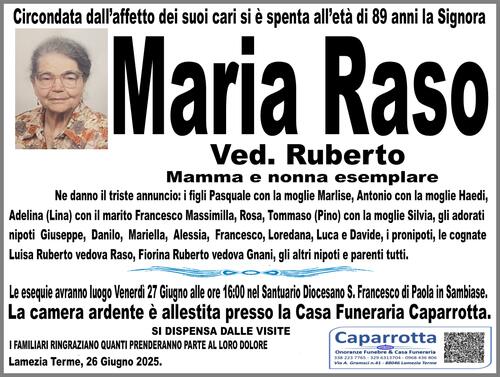 Ne danno il triste annuncio: i figli Pasquale con la moglie Marlise, Antonio con la moglie Haedi, Adelina (Lina) con il marito Francesco Massimilla, Rosa,Tommaso (Pino) con la moglie Silvia, gli adorati nipoti Giuseppe, Danilo, Mariella, Alessia, Francesco, Loredana, Luca e Davide, i pronipoti, le cognate Luisa Ruberto vedova Raso, Fiorina Ruberto vedova Gnani, gli altri nipoti e parenti tutti.