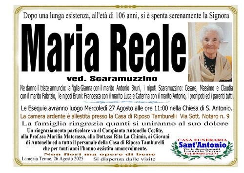 Ne danno il triste annuncio: la figlia Gianna con il marito Antonio Bruni, i nipoti Scaramuzzino: Cesare, Massimo e Claudia con il marito Fabrizio, le nipoti Bruni: Francesca con il marito Luca e Caterina con il marito Antonio, i pronipoti ed i parenti tutti.