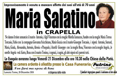 Le Esequie avranno luogo Venerdì 21 Dicembre alle ore 10.30 nella Chiesa della Pietà .