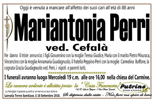 I funerali avranno luogo Mercoledì 19 c.m. alle ore 16,00 nella chiesa del Carmine.