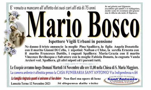 Ne danno il triste annuncio la moglie Pina Spalliera, la figlia Angela Donatella con il marito Gianni Di Cello, i nipotini: Nathan e Chloe, la sorella Ernesta con il marito Francesco Dattilo, i cognati Spalliera: Maria Grazia con il marito Vincenzo Bevilacqua e Salvatore con la moglie Fabiola Donato, la cognata Vanda Arcieri ved. Spalliera, gli altri nipoti ed i parenti tutti.