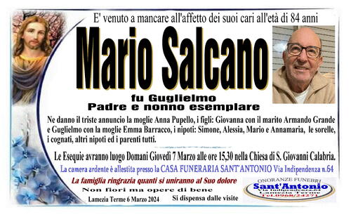 Ne danno il triste annuncio la moglie Anna Pupello, i figli: Giovanna con il marito Armando Grande e Guglielmo con la moglie Emma Barracco, i nipoti: Simone, Alessia, Mario e Annamaria, le sorelle, i cognati, gli altri nipoti ed i parenti tutti.