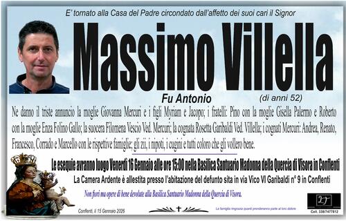 Ne danno il triste annuncio la moglie Giovanna Mercuri e i figli Myriam e Jacopo; i fratelli: Pino con la moglie Gisella Palermo e Roberto con la moglie Enza Folino Gallo; la suocera Filomena Vescio Ved. Mercuri; la cognata Rosetta Garibaldi Ved. Villella; i cognati Mercuri: Andrea, Renato, Francesco, Corrado e Marcello con le rispettive famiglie; gli zii, i nipoti, i cugini e tutti coloro che gli vollero bene.