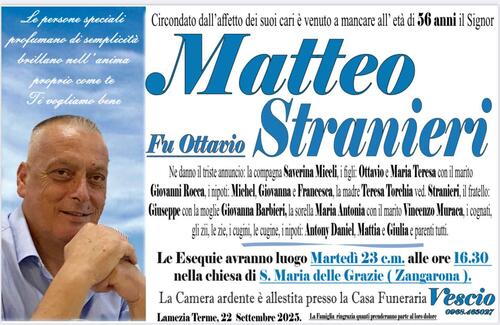 Le Esequie avranno luogo Martedì 23 c.m. alle ore 16.30 nella chiesa di S. Maria delle Grazie ( Zangarona ).