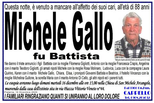 Le esequie avranno luogo domani martedì 16 dicembre alle ore 15,00 nella Chiesa di San Michele Arcangelo,