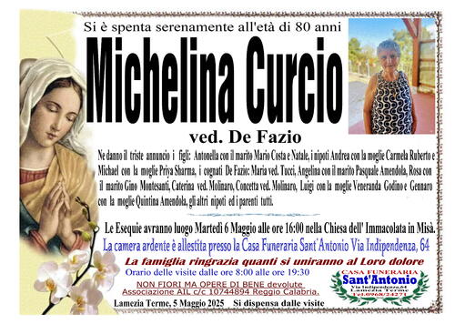 Ne danno il triste annuncio i figli: Antonella con il marito Mario Costa e Natale, i nipoti: Andrea con la moglie Carmela Ruberto e Michael con la moglie Priya Sharma, i cognati De Fazio: Maria ved. Tucci, Angelina con il marito Pasquale Amendola, Rosa con il marito Gino Montesanti, Caterina ved. Molinaro, Concetta ved. Molinaro, Luigi con la moglie Veneranda Godino e Gennaro con la moglie Quintina Amendola, gli altri nipoti ed i parenti tutti.