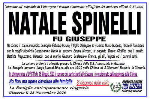 Le Esequie avranno luogo Lunedì 30 c.m. alle ore 10:30 nella Chiesa di S.Giovanni Battista in Gizzeria.