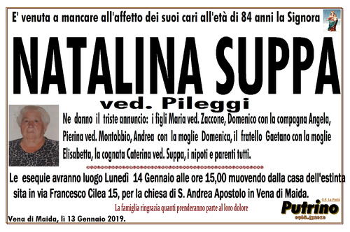 Le esequie avranno luogo Lunedì 14 Gennaio alle ore 15,00 muovendo dalla casa dell'estinta