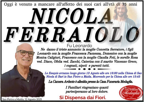 Oggi è venuto a mancare all'affetto dei suoi cari all'età di 75 anni Nicola Ferraiolo Ne danno il triste annuncio: la moglie Concetta Serratore, i figli Leonardo con la moglie Francesca Paonessa, Domenico con la moglie Monica Caligiuri, Francesco con la moglie Claudia Foti, le sorelle Rosa ved. Diaco, Ofelia ved. Zacchi, Caterina con il marito Vincenzo Greco, i cognati, nipoti e parenti tutti.Le Esequie avranno luogo giorno 13 Agosto alle ore 16:00 nella Chiesa di San Nicola di Bari in San Pietro a Maida. Muovendo per la Chiesa alle ore 15:45 La Camera Ardente è allestita presso la Casa Funeraria Medaglia.