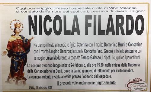Le esequie avranno luogo sabato 24 febbraio, alle ore 15.30 nella chiesa della Madonna della Consolazione in Dasà , dove la salma giungerà direttamente per il rito funebre. La camera ardente è stata allestita presso l'obitorio dell'ospedale civile di Vibo Valentia.