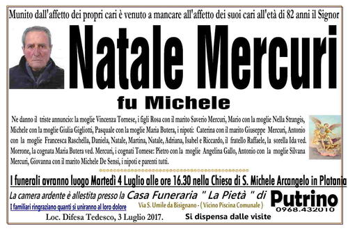 I funerali avranno luogo Martedì 4 Luglio alle ore 16.30 nella Chiesa di S. Michele Arcangelo in Platania