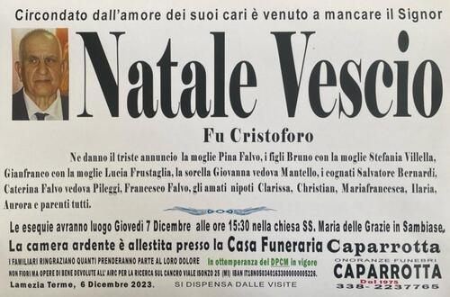 Le esequie avranno luogo Giovedì 7 Dicembre alle ore 15:30 nella Chiesa SS. Maria delle Grazie in Sambiase.