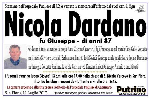 I funerali avranno luogo Giovedì 13 c.m. alle ore 17,00 nella chiesa di S. Nicola Vescovo in San Floro,