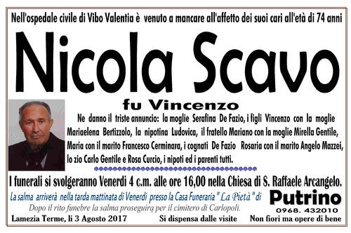 I funerali si svolgeranno Venerdi 4 c.m. alle ore 16,00 nella Chiesa di S. Raffaele Arcangelo.
