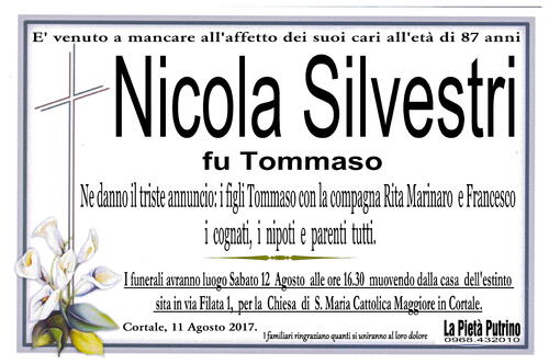 I funerali avranno luogo Sabato 12 Agosto alle ore 16.30 muovendo dalla casa dell'estinto