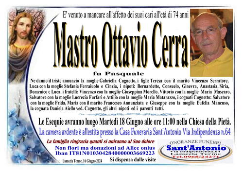 Ne danno il triste annuncio la moglie Gabriella Cugnetto, i figli: Teresa con il marito Vincenzo Serratore, Luca con la moglie Stefania Ferraiuolo e Cinzia, i nipoti: Bernardette, Consuelo, Ginevra, Anastasia, Siria, Domenico e Luca, i fratelli: Vincenzo con la moglie Giuseppina Morello, Vittorio con la moglie Maria Mascaro, Salvatore con la moglie Lucrezia Furfari e Attilio con la moglie Maria Matarazzo, i cognati Cugnetto: Salvatore con la moglie Frida, Maria con il marito Francesco Annunziata e Giuseppe con la moglie Eufelia Mancuso, la cognata Daniela Aiello ved. Cugnetto, gli altri nipoti ed i parenti tutti.