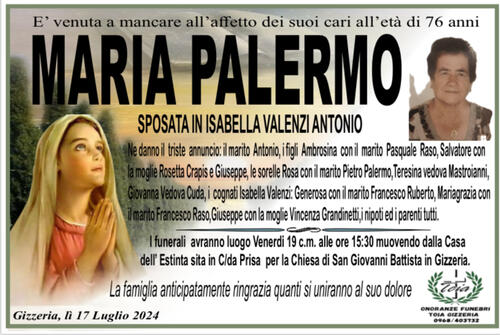 I funerali avranno luogo Venerdi 19 c.m. alle ore 15:30 muovendo dalla Casa