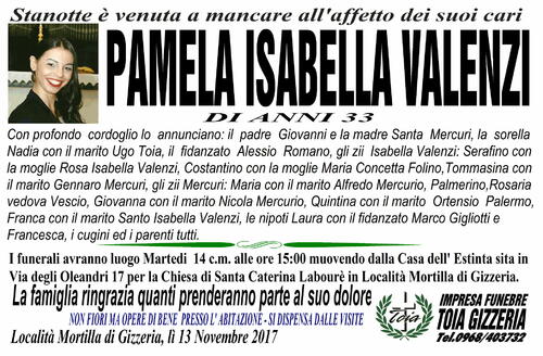 “Tutta la famiglia Mastroianni Pierino e Vaccaro si unisce al grande dolore che ha colpito la famiglia Isabella Valenzi per la prematura scomparsa della loro amata figlia. Che il Signore accolga fra le sue braccia misericordioso Pamela e dia conforto e forza a tutti i suoi familiari di andare avanti. ”
