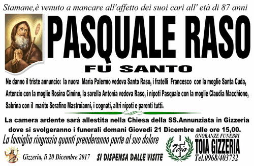 Ne danno il triste annuncio: la nuora Maria Palermo vedova Santo Raso, i fratelli Francesco con la moglie Santa Cuda,
