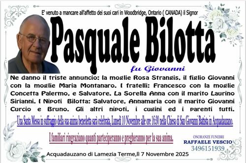 ne danno il triste annuncio: la moglie Rosa Strangis , il figlio Giovanni con la moglie Maria Montanaro .I fratelli Francesco con la moglie Concetta Palermo e Salvatore. La sorella Anna con il marito Laurino Sirianni. I nipoti Bilotta: Salvatore ,Annamaria con il marito Giovanni Curcio, e Bruno. Gli altri nipoti, cugini e parenti tutti.
