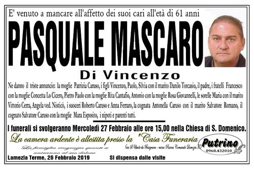 I funerali si svolgeranno Mercoledì 27 Febbraio alle ore 15,00 nella Chiesa di S. Domenico.