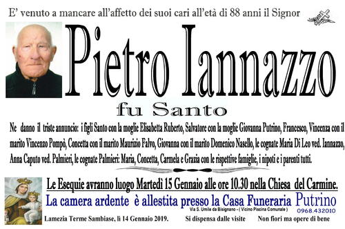 Lamezia Terme Sambiase, lì 14 Gennaio 2019. Si dispensa dalle visite Non fiori ma opere di bene O.F. Putrino 0968/432010