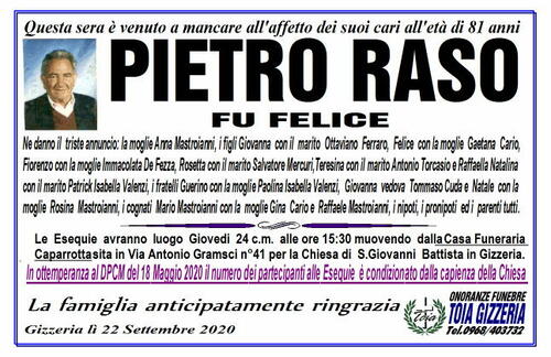 Le Esequie avranno luogo Giovedi 24 c.m. alle ore 15:30 muovendo dalla Casa Funeraria Caparrotta Via Antonio Gramsci n°41 per la Chiesa di S.Giovanni Battista in Gizzeria.