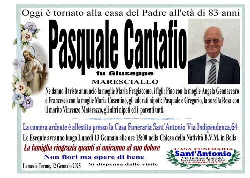 Ne danno il triste annuncio la moglie Maria Fragiacomo, i figli: Pino con la moglie Angela Gennaccaro e Francesco con la moglie Maria Cosentino, gli adorati nipoti: Pasquale e Gregorio, la sorella Rosa con il marito Vincenzo Matarazzo, gli altri nipoti ed i parenti tutti.
