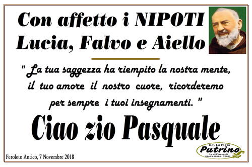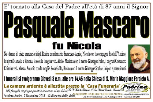 I funerali si svolgeranno Giovedì 8 c.m. alle ore 14.45 nella Chiesa di S. Maria Maggiore Feroleto A.