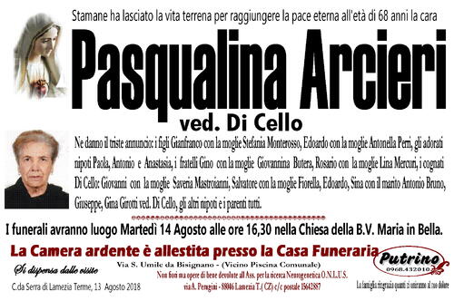 I funerali avranno luogo Martedì 14 Agosto alle ore 16,30 nella Chiesa della B.V. Maria in Bella.
