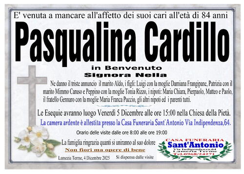 Ne danno il triste annuncio il marito Aldo, i figli: Luigi con la mogli Damiana Frangipane, Patrizia con il marito Mimmo Caruso e Peppino con la moglie Tonia Rizzo, i nipoti: Maria Chiara, Pierpaolo, Matteo e Paolo, il fratello Gennaro con la moglie Maria Franca Puccio, gli altri nipoti e parenti tutti.
